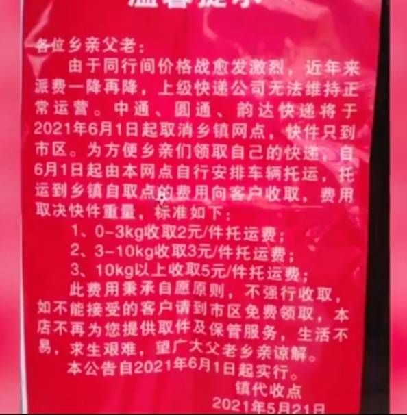 据财经网报道,在广西贺州,有快递公司近日张贴出海报,称自2021年6月1日起取消乡镇网点,快件只到市区。为方便乡亲领取自己的快递,网点会安排车辆托运,但托运到乡镇自取点的费用要向客户收取。