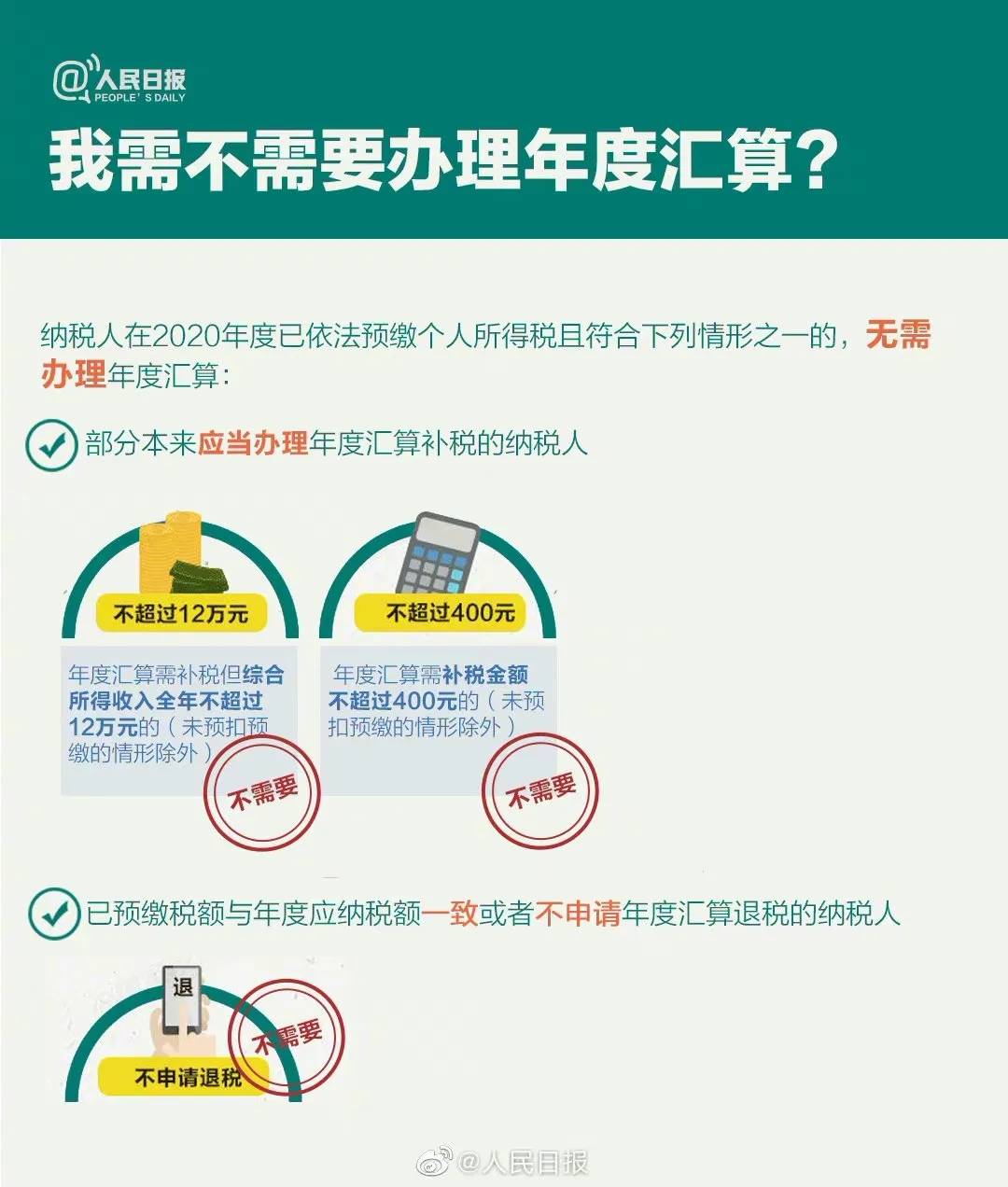 第一种:2020年度综合所得收入不超过12万元或应补税额不超过400元,且已依法预缴税额的,可免于汇算,也就是不用补税;