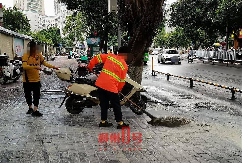 记者赶到现场时,电动车明火已被熄灭,被移至人行道上。车身已被烧焦,仅剩下烧黑的车架,还散发出一股烧焦味。车主和清洁工正在现场打扫电动车剩下的残骸。