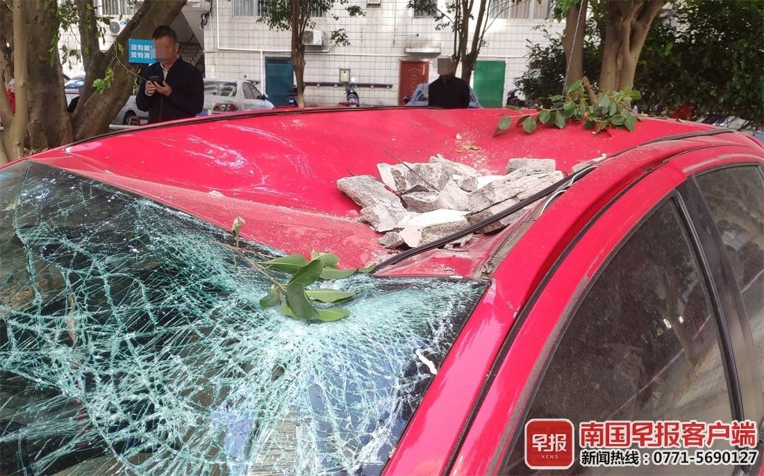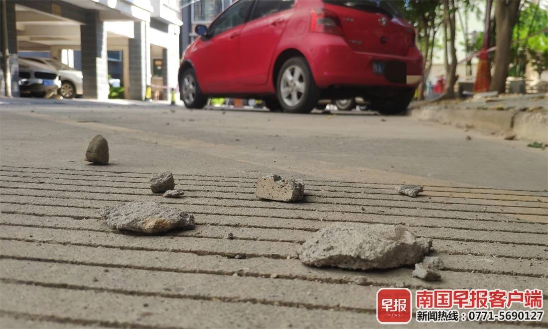 11月30日下午4时许,南宁市新岸路旺南小区一高层住宅发生阳台边沿水泥块脱落,砸中楼下停放的一辆小车,所幸未造成人员损伤。12月1日,该小区物管表示,他们会与业委会沟通并尽快拿出赔偿方案。