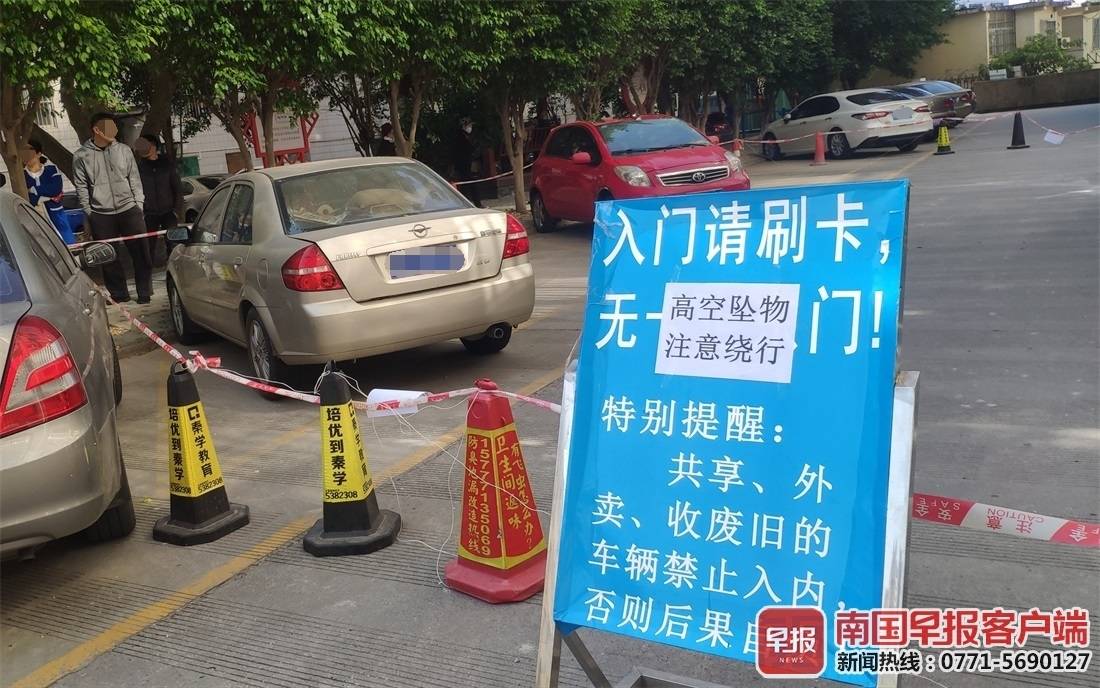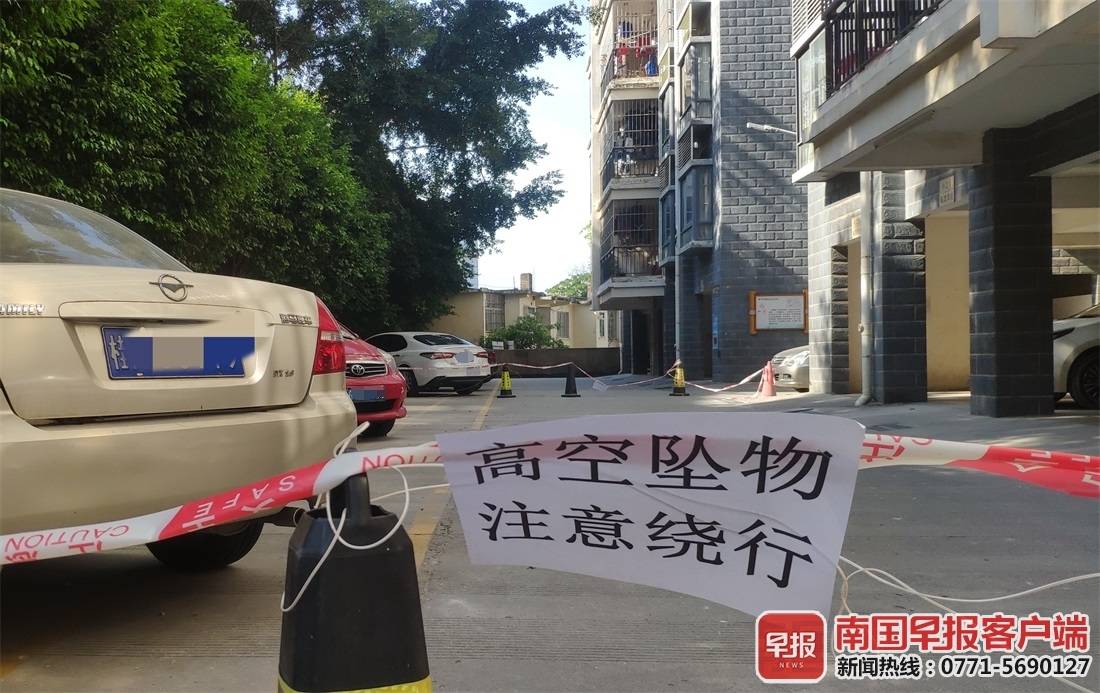12月1日上午,南国早报客户端记者来到旺南小区,发现被砸的车辆仍停放在小区里,车辆车顶被砸严重凹陷,前挡风玻璃被震碎裂。过道上已经拉起警戒带,并张贴了“高空坠物”的危险提示。