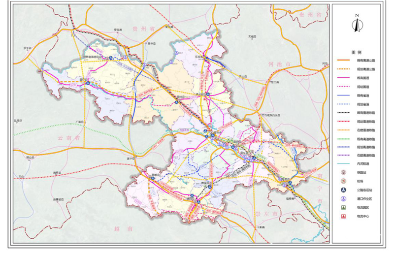 打造区域性综合交通枢纽。加强与贵阳、昆明等周边重点枢纽城市互联互通,强化与北部湾城市群有效衔接,完善综合交通运输网络,推进各种运输方式一体化融合发展。优化枢纽场站布局,加强百色市内河港、无水港建设,改善口岸交通衔接条件,提升龙邦、平孟等口岸交通便利度和货运服务能力。完善枢纽衔接设施,推进直达内河港物流园区的铁路专用线建设。加快对接中欧班列,建设海铁联运、跨境公路运输有机衔接的多式联运体系,创建国家物流枢纽承载城市。