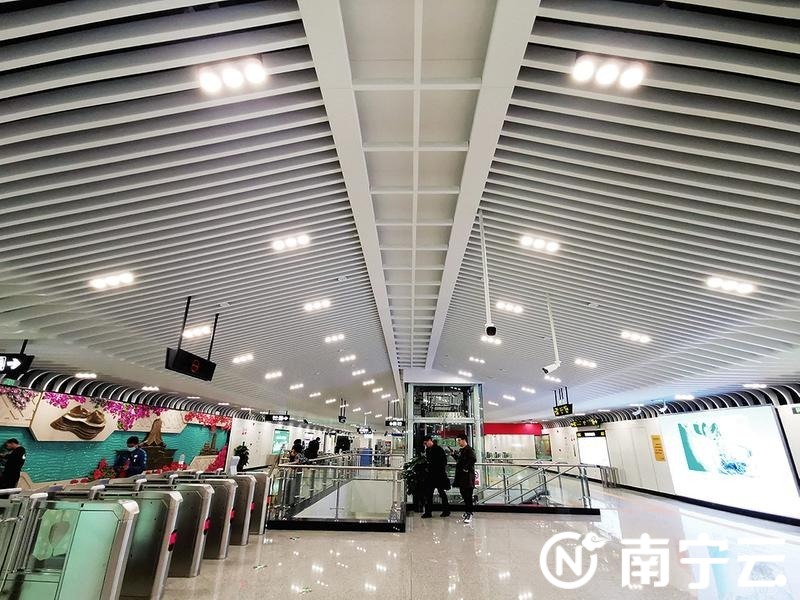 地铁5号线金桥客运站创新设计了无柱大跨地铁车站,空间更宽敞,还有“邕城花开”艺术墙。