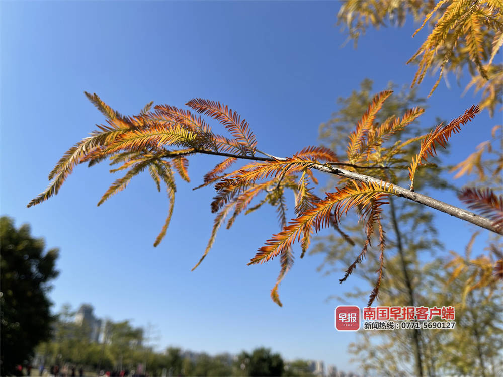 落羽杉的颜色随天气而变化,所以,相对于市内的公园,在南宁市一些江边的草坪上、市郊的湿地这些地气温较低,这些落羽杉会最先展现其热情的颜色。在北湖北路附近的湿地里、花花大世界、龙岗大桥南岸附近的落羽杉已经整片红色,扎根于水中的落羽杉与蓝天碧水青山相映,成为市民在朋友圈里最美的风景。