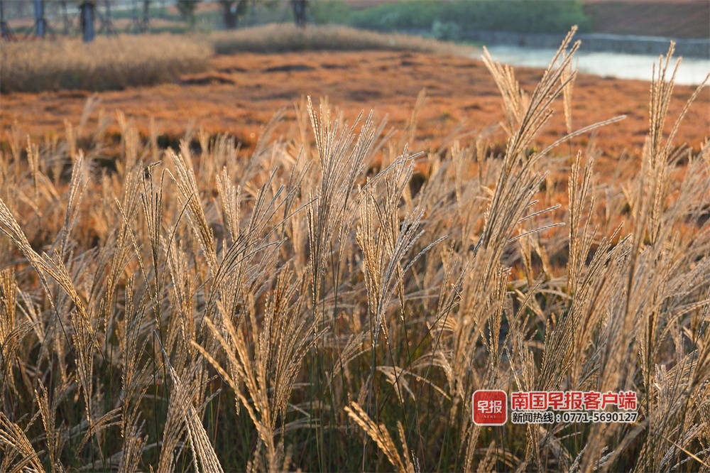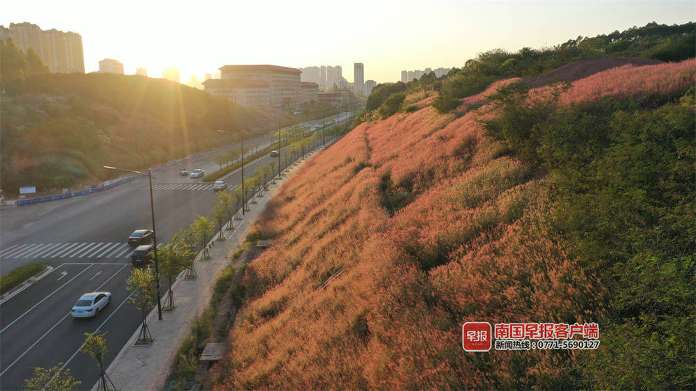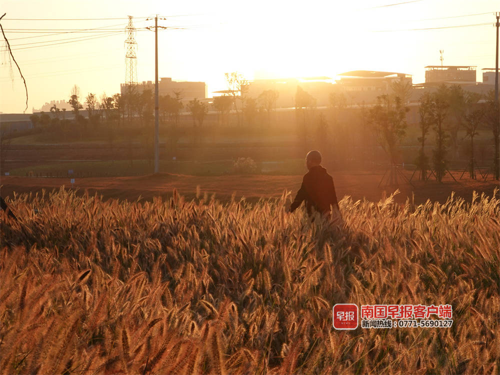 ▲在良庆区阳春路一处小山坡,夕阳下的糖蜜草。