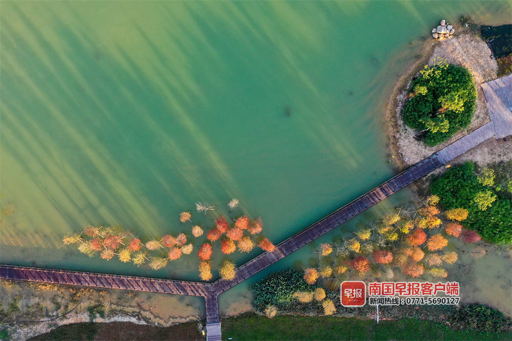 ▲南宁龙岗大桥南岸邕江边的一片落羽杉变色了。