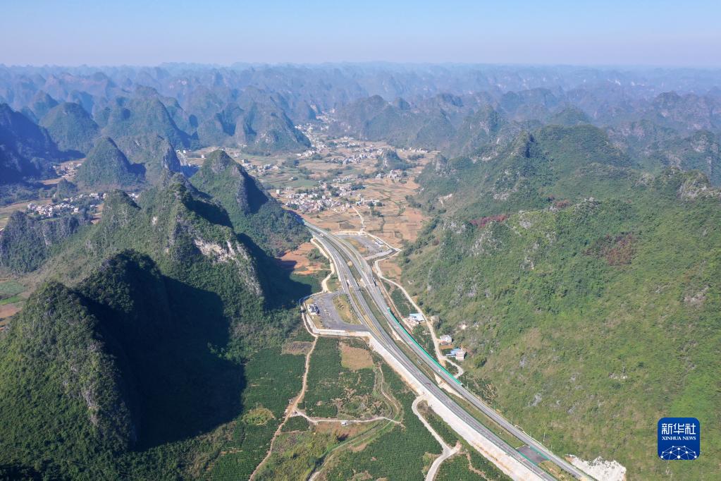 这是广西都安瑶族自治县境内的都安至巴马高速公路及乡村道路(12月1日摄,无人机照片)。