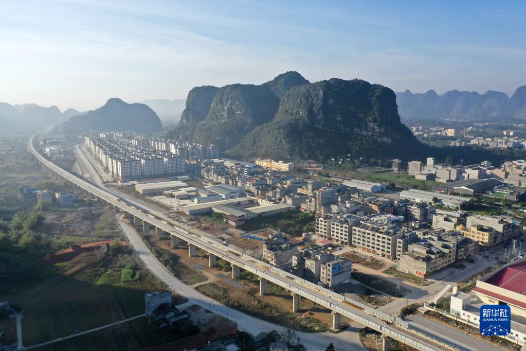这是广西都安瑶族自治县境内正在修建的贵阳至南宁高铁及县城环城公路(12月1日摄,无人机照片)。
