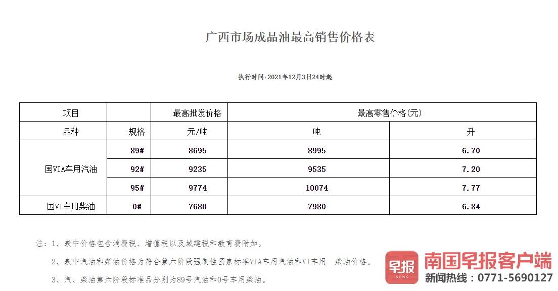 12月3日,南国早报客户端记者从自治区发展改革委获悉,根据国家成品油价格形成机制,结合近一段时期国际市场油价变化情况,国家发展改革委决定自2021年12月3日24时起下调国内成品油价格,即在现行价格的基础上,汽、柴油价格每吨分别下调430、415元。