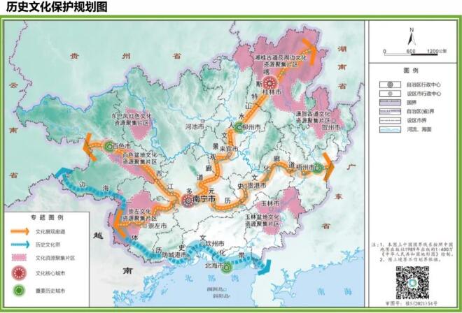 “双核四城”:双核指南宁和桂林两个文化核心城市;四城指柳州、梧州、北海、百色四个重要历史城市。