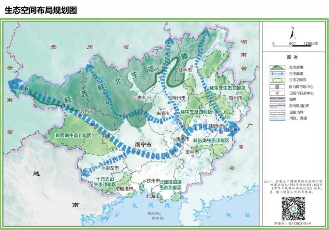 《规划》指出,构建“一屏六区一廊+一片海”的国土生态安全格局。“一屏”指桂西桂北生态屏障;“六区”指桂东北生态功能区、北部湾沿海生态功能区、桂西南生态功能区、桂中生态功能区、桂东南生态功能区和十万大山生态功能区;“一廊”指西江干流(南盘江、红水河、黔江、浔江)、郁江、柳江、北流河、桂江、贺江等西江水系为主体的绿色生态廊道;“一片海”指落实北部湾海域海洋生态保护红线、一般生态空间、生态红线类海岛、生态控制类海岛为主的海洋生态空间。