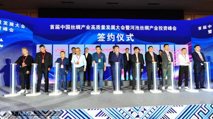 会议期间,河池市人民政府分别与中国丝绸协会、天津工业大学纺织科学与工程学院、浙江传媒学院文化创意与管理学院、河池学院签订了“中国丝绸产业高质量发展战略合作”“茧丝绸全产业链人才孵化基地建设”“茧丝绸产业区域公用品牌建设”“蚕沙提取叶绿素课题成果转换”项目的框架合作协议,宜州区人民政府则与深圳东方赛富投资有限公司等公司签订了入驻宜州轻纺城意向合作项目20个,另聘请宜州区茧丝绸高质量发展专家顾问6人,并向其颁发聘书。大会闭幕前,还举行了丝绸品牌电商直播带货启动仪式。