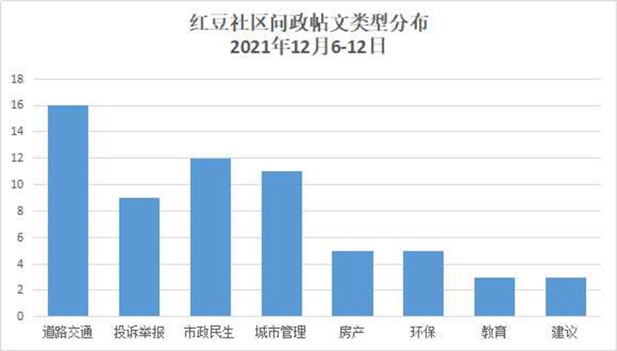 据统计,12月6-12日,网民反映各类问题较多,其中道路交通类问题最多,占比为25%;其次,有关市政民生和城市管理类问题较多,占比分别为19%和17%;另外,涉及环保、住房、教育类等问题的帖文也受到一定关注。
