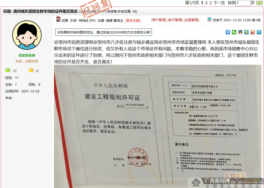 12月7日,贺州市八步区建设局对《请问城东碧园生鲜市场的证件是否真实》一帖进行回复: