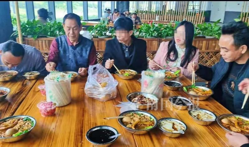 认亲仪式结束后,太阳村派出所民警还带刚团聚的杨洪新一家人,一起去吃了柳州螺蛳粉。餐桌上,第一次吃螺蛳粉的阿波和家人一起,品味着美味的螺蛳粉,阿波夹起卤肉,放进父亲碗里,父亲脸上露出了朴素的笑容。
