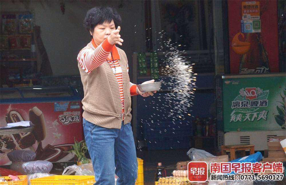 ▲何女士撒小米给麻雀喂食。南国早报客户端记者 何定坚 摄