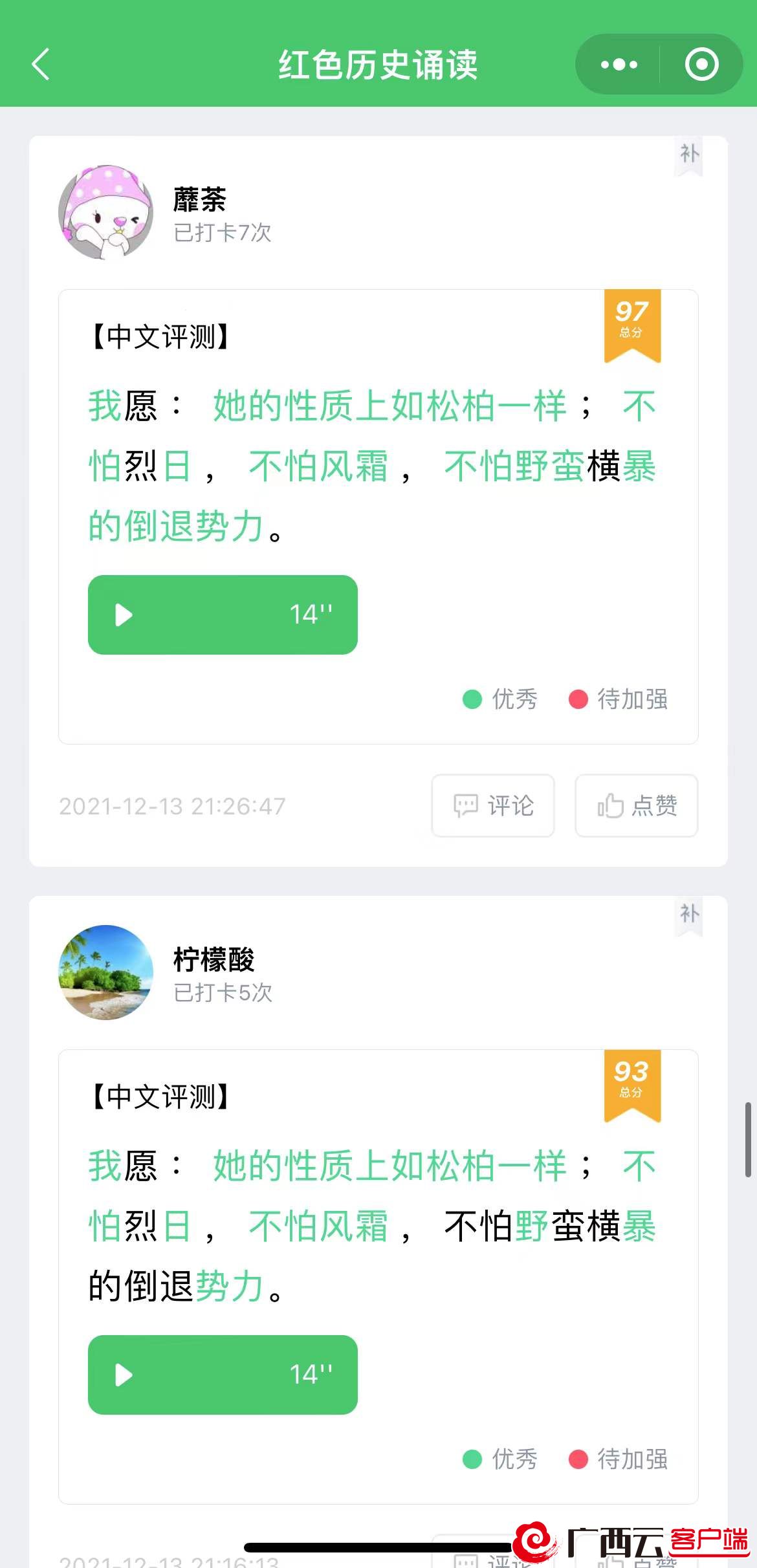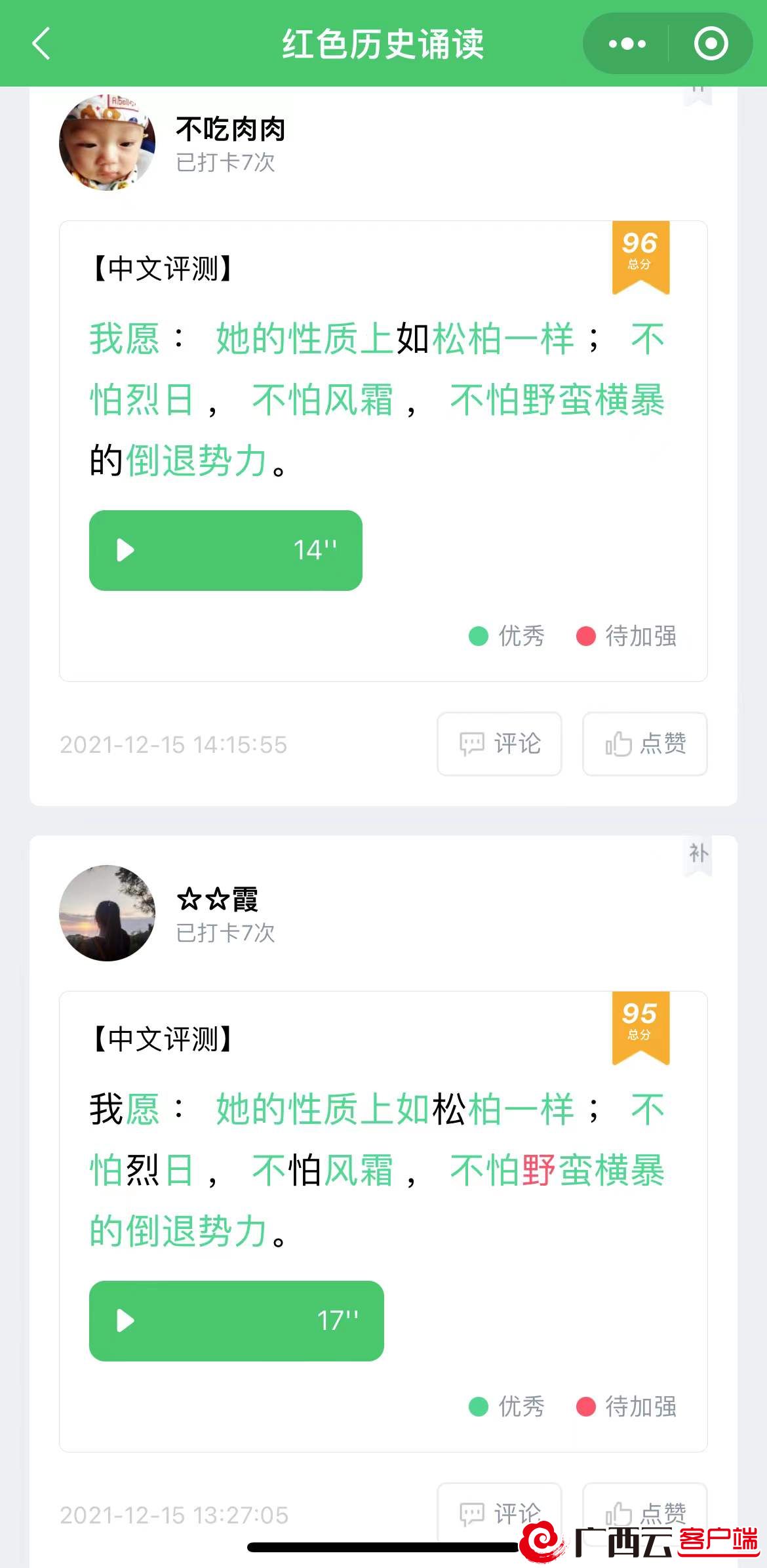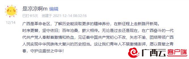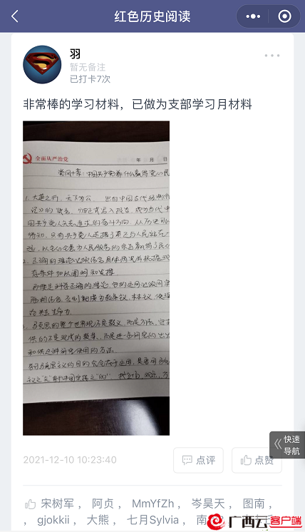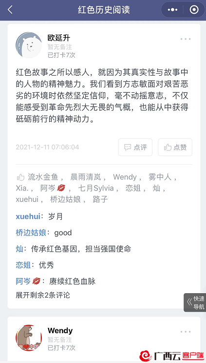 还有不少网友通过几天的阅读打卡对广西的党史发展有了更进一步的了解和感悟,有网友评论道:“又多了解了一点自己的家乡。”还有网友留言:“一定要去百色起义纪念馆看一看。”