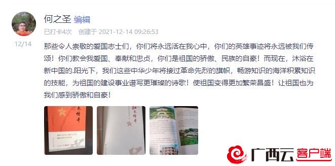 在《广西红色传奇》的阅读打卡留言区,名为“何之圣”的网友晒出了原书的照片,并且留下了自己对这本书的深刻心得体会:“那些令人崇敬的爱国志士们,你们将永远活在我心中,你们的英雄将永远被我们传颂!你们教会我爱国、奉献和忠贞,你们是祖国的骄傲、民族的自豪!”