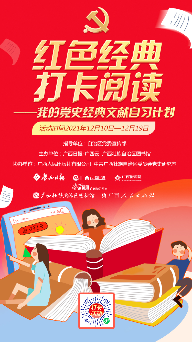 “红色经典 打卡阅读——我的党史经典文献自习计划”由自治区党委宣传部指导,广西日报-广西云联合学习强国广西学习平台,携手广西壮族自治区图书馆共同发布,并得到广西人民出版社有限公司、中共广西壮族自治区委员会党史研究室大力支持。