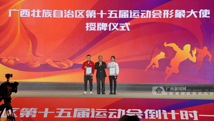 自治区体育局、贵港市委市政府有关领导以及广西第十五届运动会形象大使丘乐、杨森莲等嘉宾出席此次活动。
