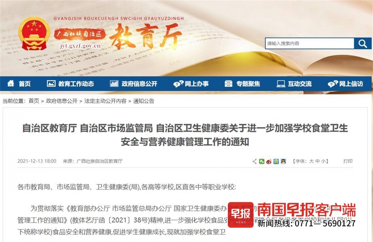 近日,自治区教育厅、自治区市场监管局、自治区卫生健康委联合发通知,要求进一步加强学校食堂卫生安全与营养健康管理工作,明确中小学校和幼儿园不得制售冷荤类、生食类、裱花蛋糕以及四季豆等高风险食品,鼓励推行小份菜、半份菜、套餐等措施,遏制餐饮浪费。