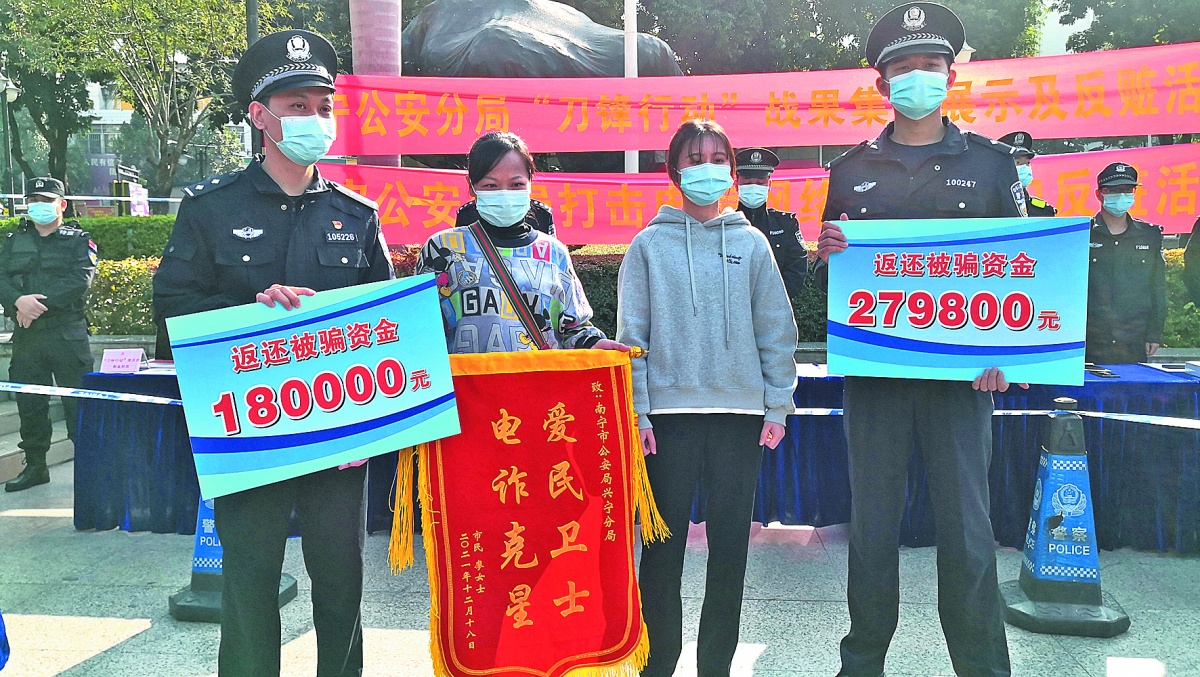 广西新闻网-南国早报南宁讯 (记者 王世杰 通讯员 祁玮 唐婧)12月18日,南宁兴宁警方在朝阳广场开展“刀锋行动”集中返赃暨电诈受骗资金集中返还活动。当天现场共集中返还被盗物品90余件,返还涉诈资金近46万元。