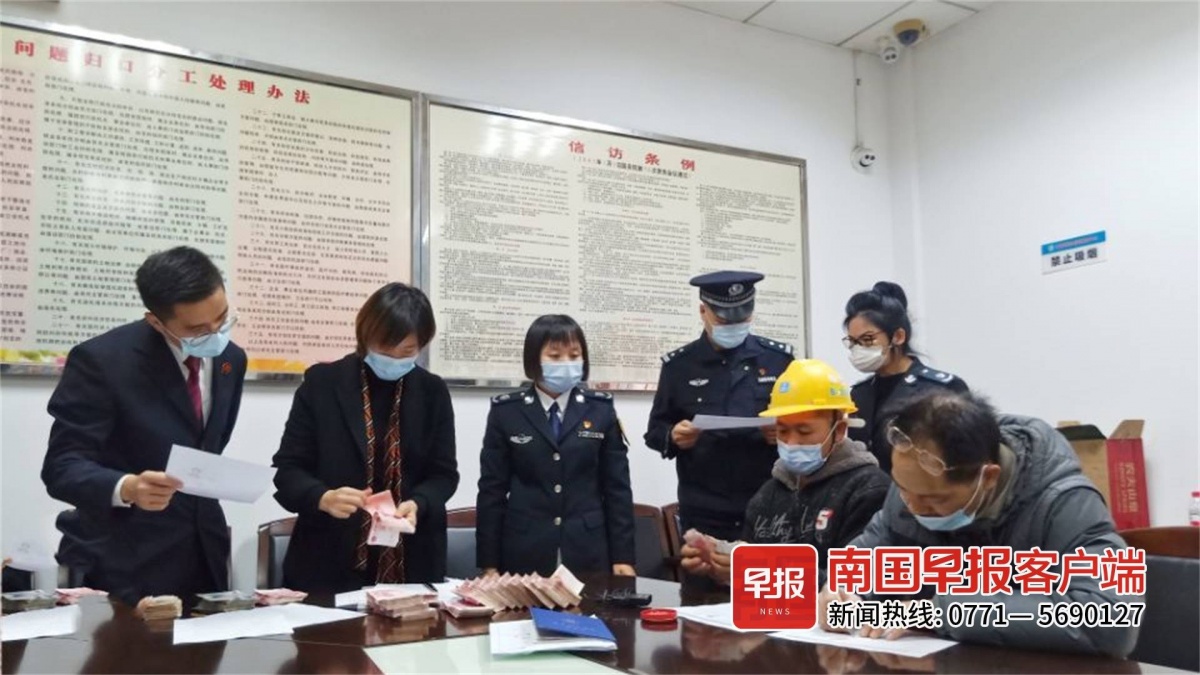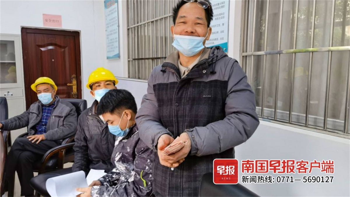 ▲工人领取在现场领取自己被拖欠近两年的工资。南宁市人社局供图