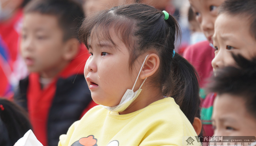 南宁市滨湖路小学(山语城校区)学生在观影过程中留下感动的泪水。