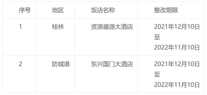 记者采访了解到,对于2家限期整改饭店:桂林资源盛源大酒店、防城港东兴国门大酒店,委员会下达了整改时间,从2021年12月10日至2022年11月10日,期限1年。被取消星级的河池寿乡大酒店(巴马瑶族自治县),自取消星级之日起一年后,方可重新申请星级评定。