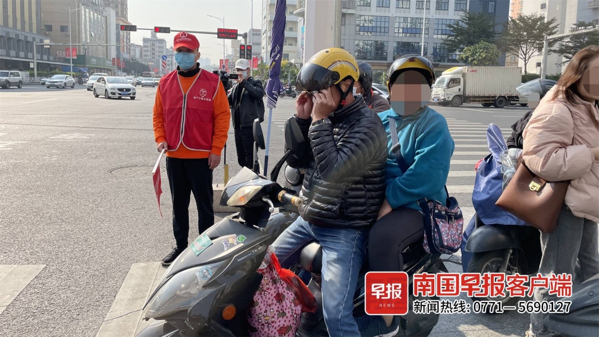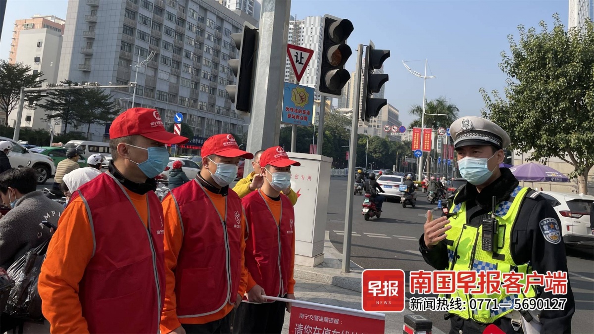“现在是红灯,请退回停止线等待通过。”“骑乘电动车,请佩戴好头盔。”12月23日上午,南国早报客户端记者在南宁市民族大道园湖路口看到,来自南宁市龙港驾校的三名学员,头戴小红帽,身着红马甲,手拿小红旗正在协助交警维护交通秩序、劝阻交通违法行为,并进行文明交通宣传。