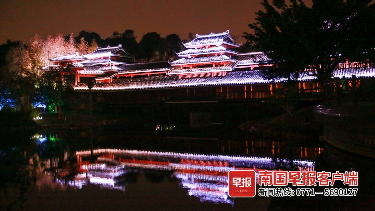晚间,园区则隆重推出“奇遇民族村 天天有惊喜”的首场夜游重头戏。记者在现场看到,夜游活动融合高科技、文化创意和民族元素于一体,致力于打造广西夜游典范。既有灯光秀,又有民族文艺演出。“桂花大道”“萤火森林”“光影稻田”等精心设置的景区引人注目,民族建筑与灯光交相辉映,美轮美奂。