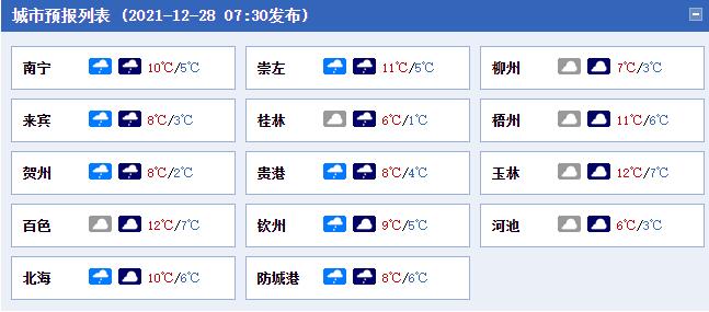 12月28日,桂北、桂东阴天大部有小雨;我区其他地区阴天有分散小雨。各地最低气温:高寒山区0~3℃,桂北3~8℃,桂南8~12℃。