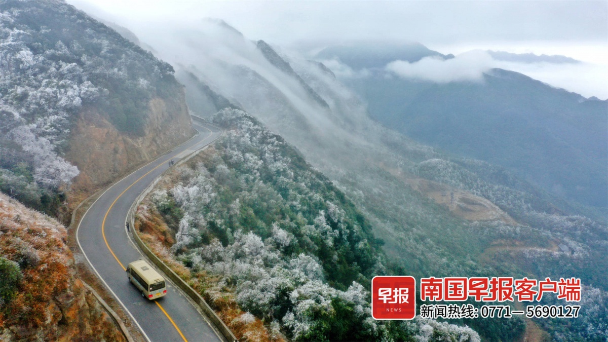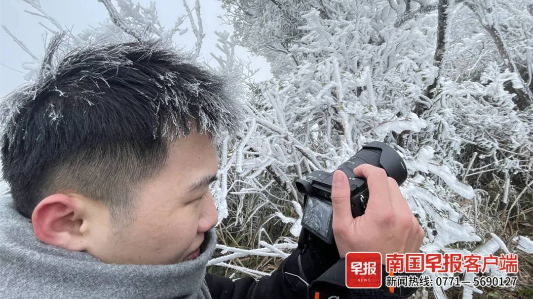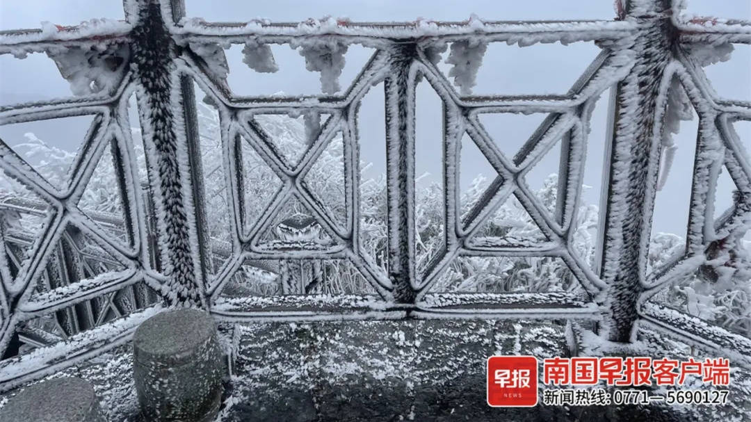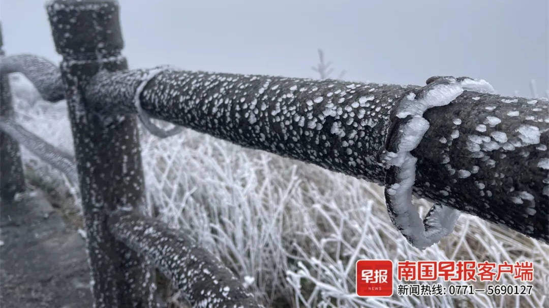 27日一早,南宁大明山上“一夜白头”,换上冬天的装扮,白茫茫一片。
