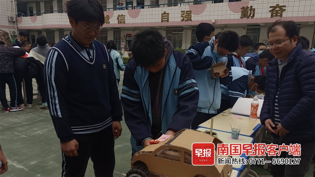 ▲南宁二十中学生用废旧纸箱制作汽车。校方供图