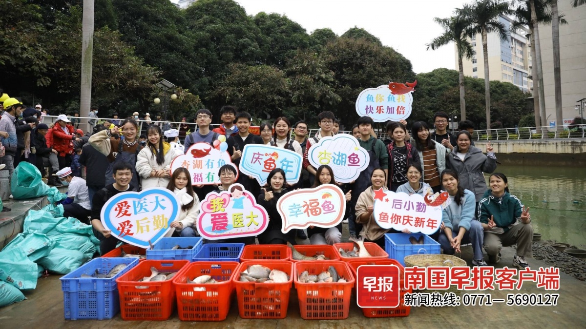 当天,广西高校也在用特别的方式迎接新年。在广西医科大学本部,校内的杏湖迎来了一年一度的“幸福鱼”捕捞,8100余斤鲳鱼、草鱼、鲶鱼、罗非鱼等被捕捞上岸,制作成老友鱼、糖醋鱼块、清蒸鱼块、剁椒鱼头、酒糟鱼等各种口味的菜肴,供全校人员免费品尝。