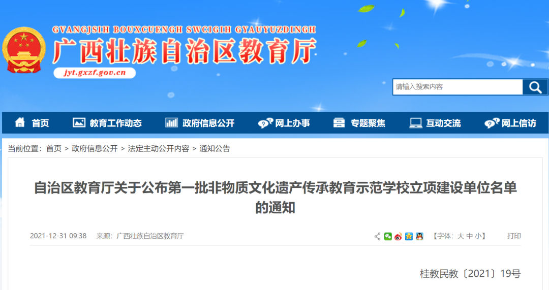 根据广西民族教育事业发展“十四五”规划,自治区教育厅启动实施民族团结进步教育示范学校建设项目,计划在“十四五”期间打造100所自治区级非物质文化遗产传承教育示范学校。经学校申报、市县推荐、专家评审、自治区教育厅审核,确定了50所学校为第一批非物质文化遗产传承教育示范学校立项建设单位。