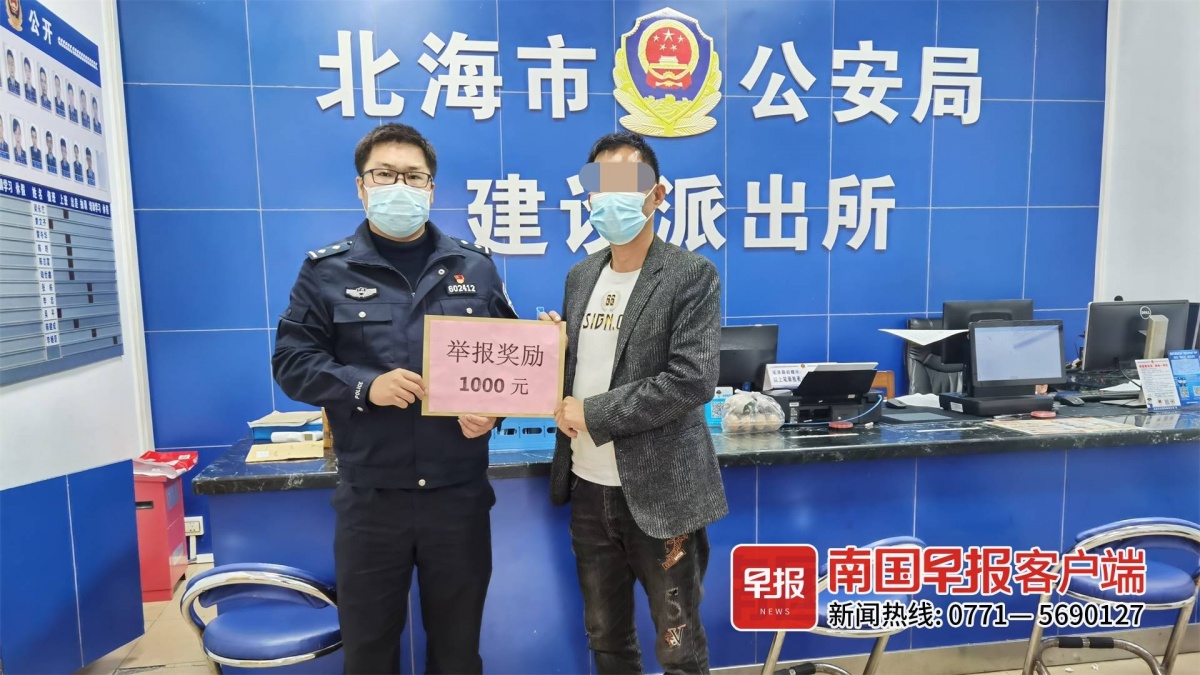 当天下午5时,谢先生从建设派出所领取到举报“三非”外国人的奖励金1000元,也是北海市首获该奖励的人。