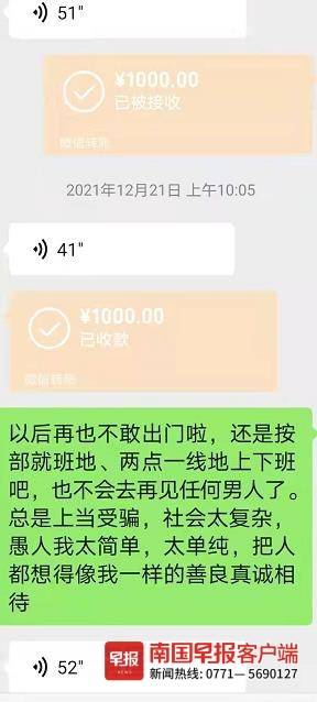 彭女士今年54岁,去年6月,她在世纪佳缘相亲网站认识了一名比她大一岁的男子张先生,两人互相加了微信。彭女士说,张先生称他是东北人,曾做过小学老师,如今在北海开有公司。彭女士对他印象还不错,交流了几个月,去年国庆节,张先生邀她到北海旅游见面,并热情地接待了她。