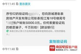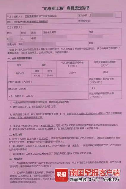 1月4日,南国早报客户端记者联系上张先生,他说他们两人是在相亲网站认识,到防城港旅游时,彭女士觉得这边风景和发展不错,有买房意愿。而自己“刚好是做房产中介的”,有一些资源,出于便利给她介绍了一个楼盘,她自己看中了房子并交付了5万元定金,全程都是她自愿,交钱也非常爽快。