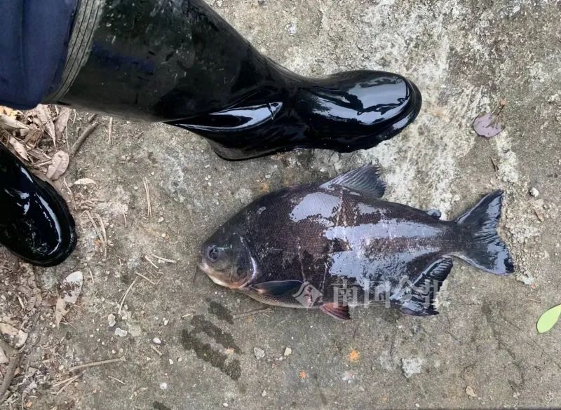 经鉴别,这条神似“食人鲳”的鲳鱼是外来入侵物种“淡水红鲳”。该鱼体型为扁盘状,背部较厚,体长约45厘米,全身发黑,鱼嘴中有锋利的牙齿。