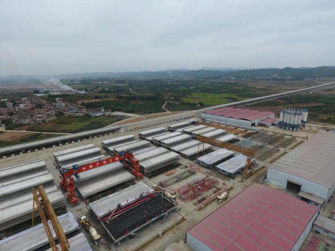 2019年9月建成投产的府城制梁场主要承担贵南高铁武鸣和马山段27座桥梁的箱梁预制和架设任务,配有数控液压调直切断机、铁路桥梁预应力自动化张拉系统、智能压浆台车等国内高铁建造的尖端设备。在箱梁预制过程中,云桂铁路广西公司和中铁广州工程局全力加快生产进度,大力开展技术攻关,对钢筋加工、模板作业、混凝土浇注和混凝土养护等主要工序进行改进,有效保证箱梁生产周期。府城制梁场预制的所有箱梁在模板安装、钢筋加工绑扎、预埋件安装等制造工艺上在业内属于领先水平。