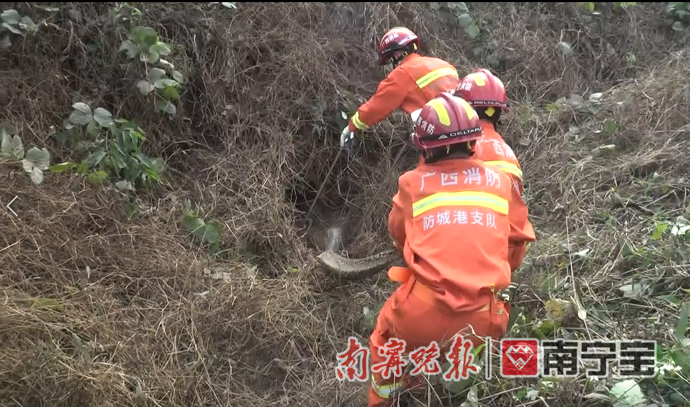 接到罗先生报警后,广西防城港市消防救援支队立即调派2辆消防车10名消防救援人员赶赴现场处置。到达现场后,看见几名市民焦急地等候在路边,顺着群众的指引,消防救援人员对着最后出现蟒蛇身影的小山坡展开地毯式搜寻。由于小山坡杂草浓密,荆棘丛生,枯草最深的已没过膝盖,这无疑给搜寻组带来了不小的难度。