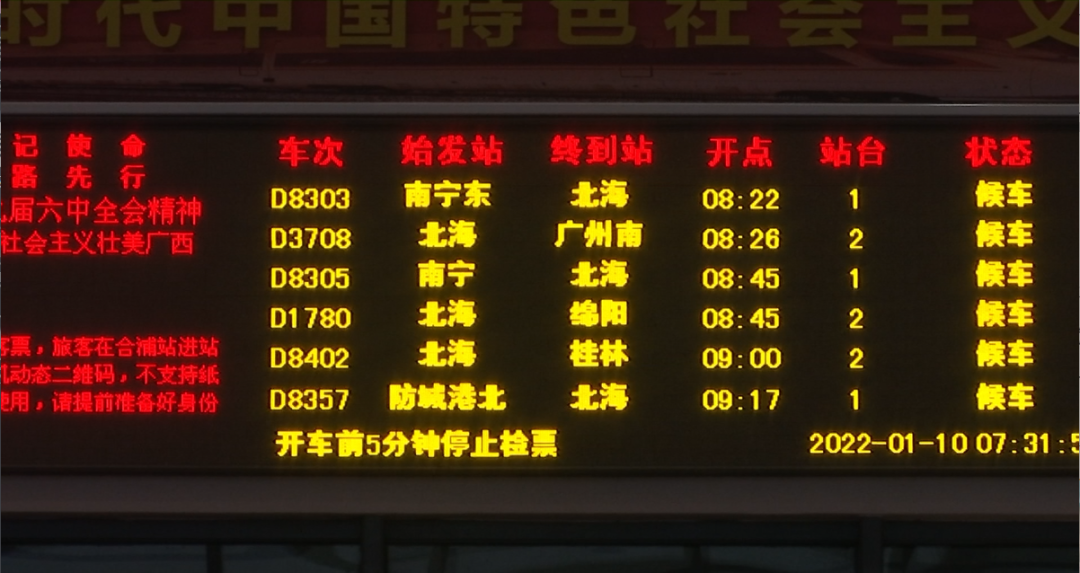 “1月10日调图后,合浦站共开行56趟列车,每趟动车组列车运行时间按250公里运行,提速后,合浦到南宁东运行时间不到一个小时,旅客朋友们在购票后注意看好自己的时间,以免耽误自己的旅行。”
