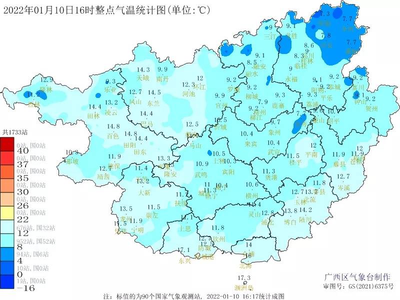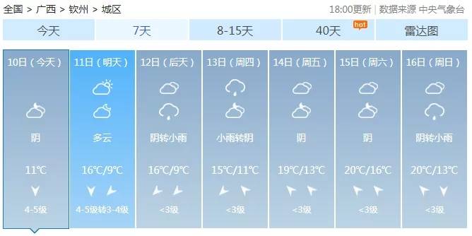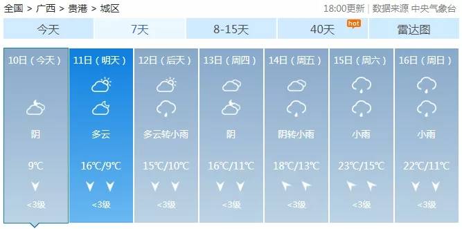 10日晚上,梧州、玉林、北海、钦州、防城港、崇左、南宁等市阴天部分地区有小雨,我区其它地区多云到阴天。桂北高寒山区有冰冻。各地最低气温:高寒山区零下1~1℃,桂东北2~7℃,其它地区8~13℃。