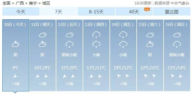 南宁市:今天晚上阴天有分散小雨,明天白天阴天到多云,东北风2级,最低气温9℃,最高气温16℃。
