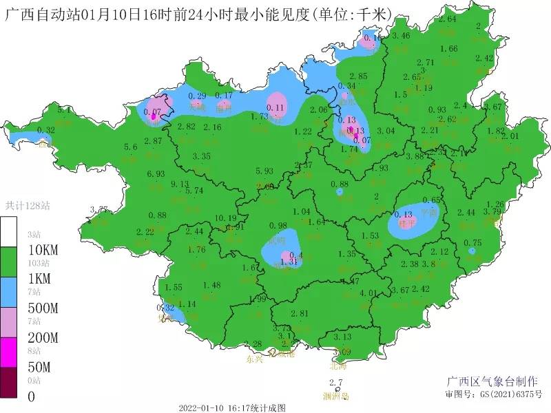 不少地方能见度较差,南宁、乐业、柳州等地最小能见度都不足100米。