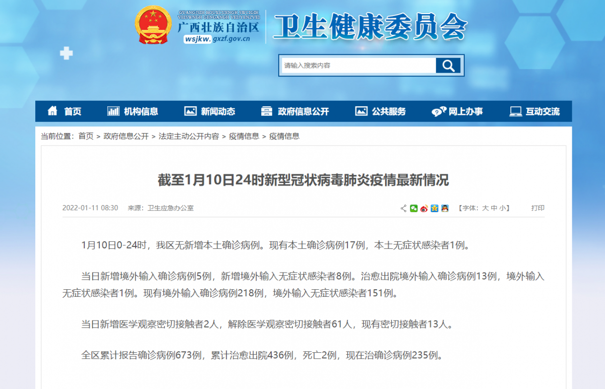 1月10日广西新增5例境外输入确诊病例