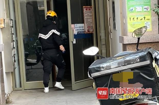 ▲外卖小哥手拿蓝色门禁通卡进出小区单元楼。南国早报客户端见习记者 罗贝尔 摄