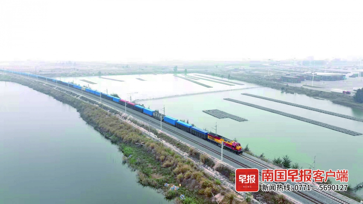 ▲广西今年发出首趟西部陆海新通道班列与中欧班列衔接班列。