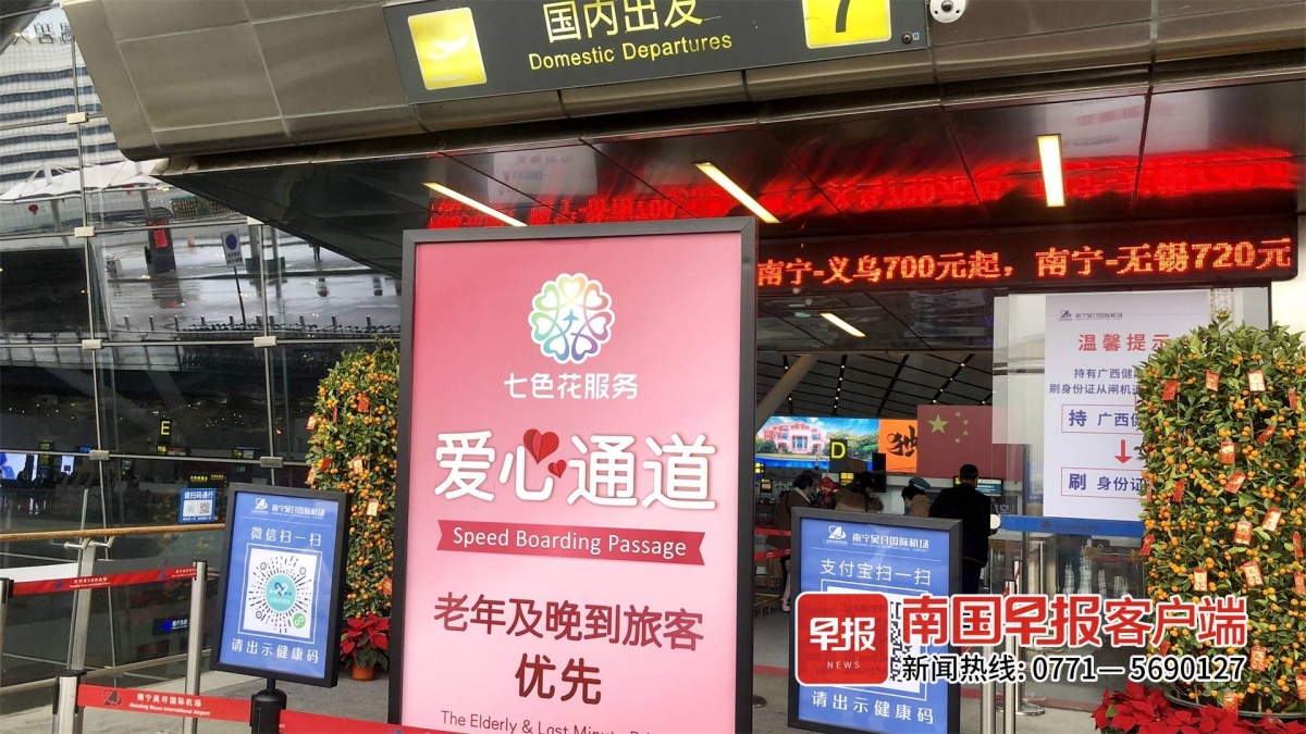 除了智慧防疫平台,南宁机场在春运期间还推出系列便民举措。春运老年、儿童等特殊旅客增多,南宁机场增开无陪老年旅客爱心服务预约热线,有需要的旅客可提前电话预约;在候机楼入口、安检通道等区域,设置有“爱心通道”和“爱心驿站”,为特殊旅客提供帮助。
